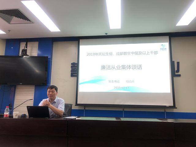 为进一步贯彻落实好“不忘初心,牢记使命”主题教育工作部署,全面推进从严治党向纵深发展,提高党员领导干部及关键岗位人员廉洁从业和履职尽责意识,2019年7月17日,天坛生物党委书记、总经理付道兴通过现场和电话会议的方式,对天坛生物和成都蓉生中层及以上党员领导干部、关键岗位管理人员进行了集体廉洁谈话提出三点要求:
