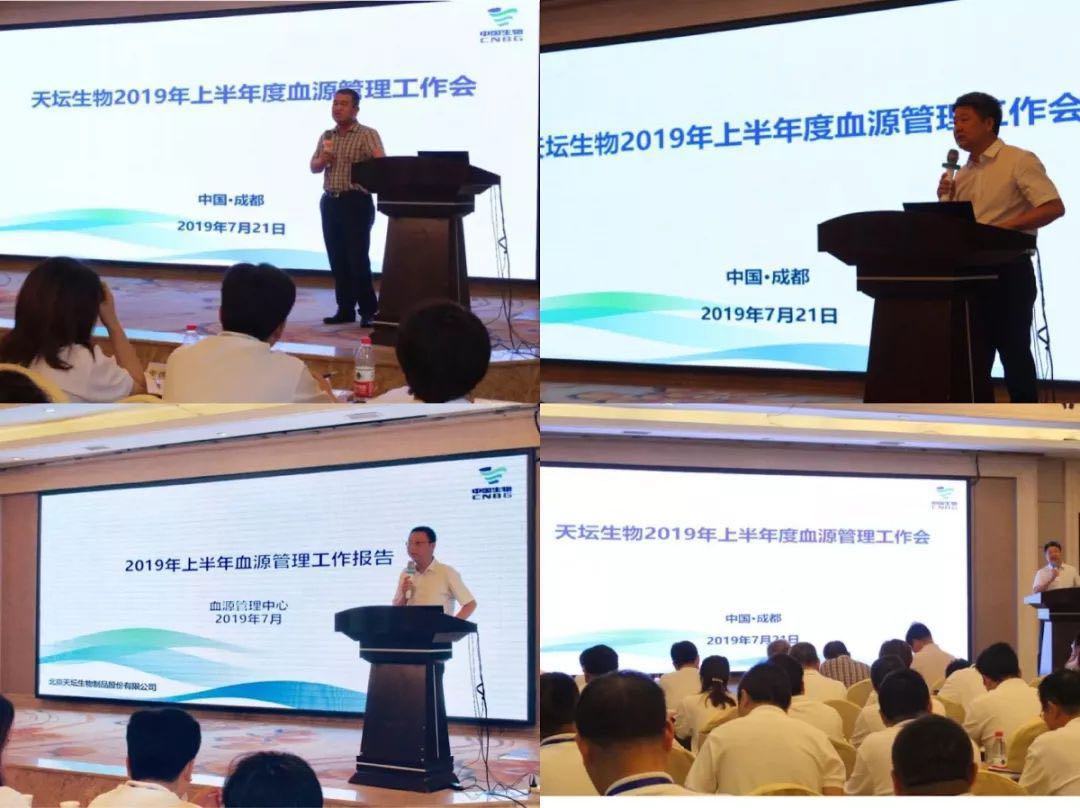 7月21日,天坛生物2019年上半年血源管理工作会议在成都召开。总经理、党委书记付道兴,副总经理何彦林、杜晓,兰州血制副总经理(主持工作)杨福军、武汉血制财务总监冯英、天坛生物血源管理中心及有关部门负责人、51家浆站高管和党支部书记共计90余人参加了本次会议。会议由党委副书记、纪委书记、副总经理周东波主持。
