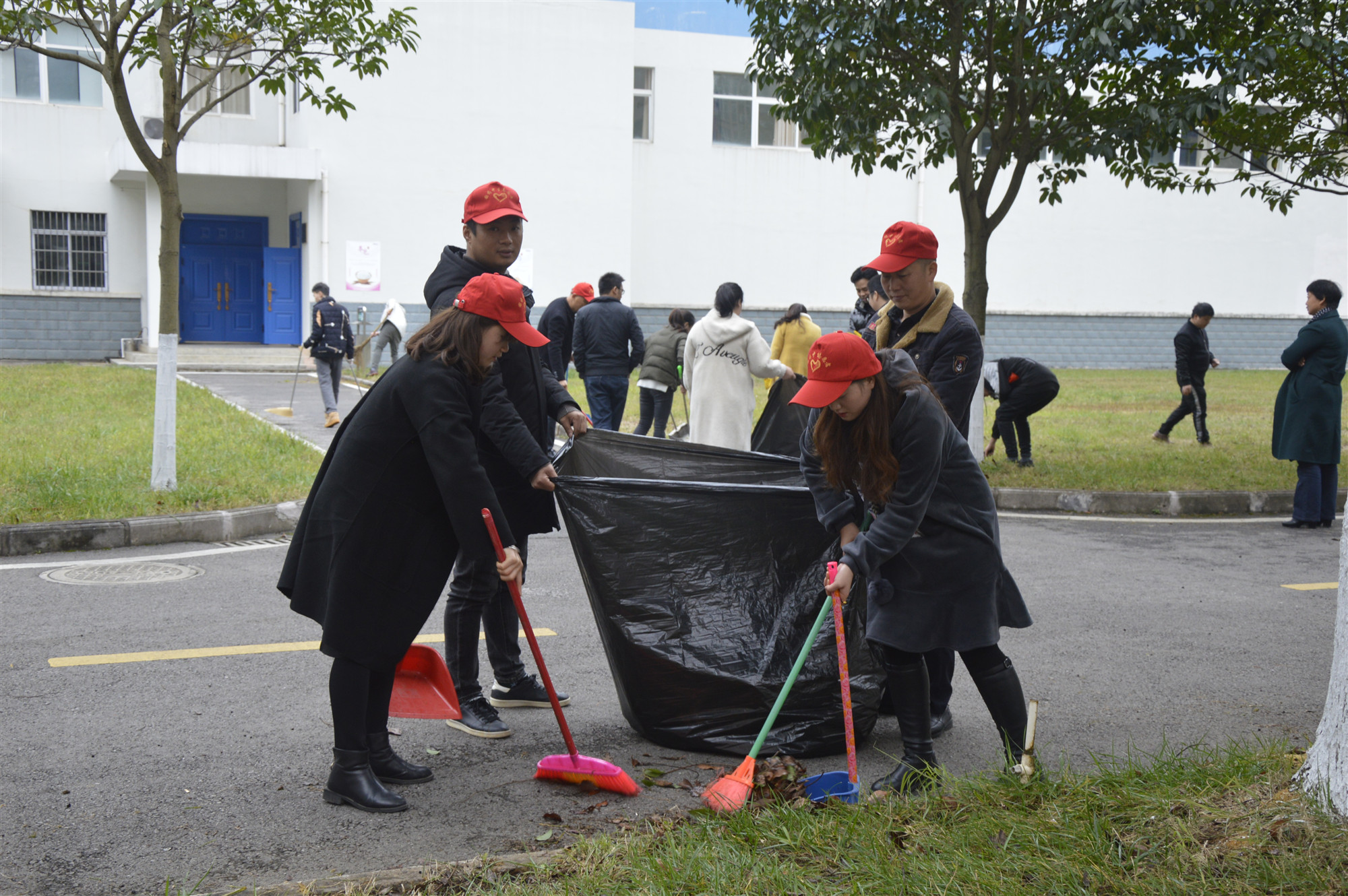 时处冬季,寒冷的天气并没有阻挡大家的热情,员工们有的清除墙壁污痕,有的打扫地上落叶,有的拔除草坪杂草,欢声笑语,一片热闹景象。
