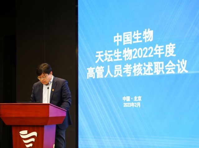 2月8日,天坛生物召开2022年度高管人员考核述职会。中国生物副总裁(主持经营工作)杨汇川、副总裁孙京林、质量管理部主任潘海龙等考核组成员,天坛生物领导班子、董事会秘书、中层管理人员、职工代表、血制公司及浆站高管共170余人参加会议。
