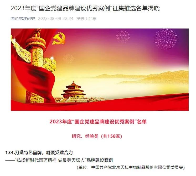 近日,由中国企业改革与发展研究会指导、中国企业管理研究会企业党建研究院支持、《国企》杂志主办的2023年度国企党建品牌建设优秀案例征集推选名单揭晓。天坛生物弘扬新时代国药精神 做最美天坛人党建品牌在1000余个参选案例中脱颖而出,成功入选研究、经验类国企党建品牌建设优秀案例。