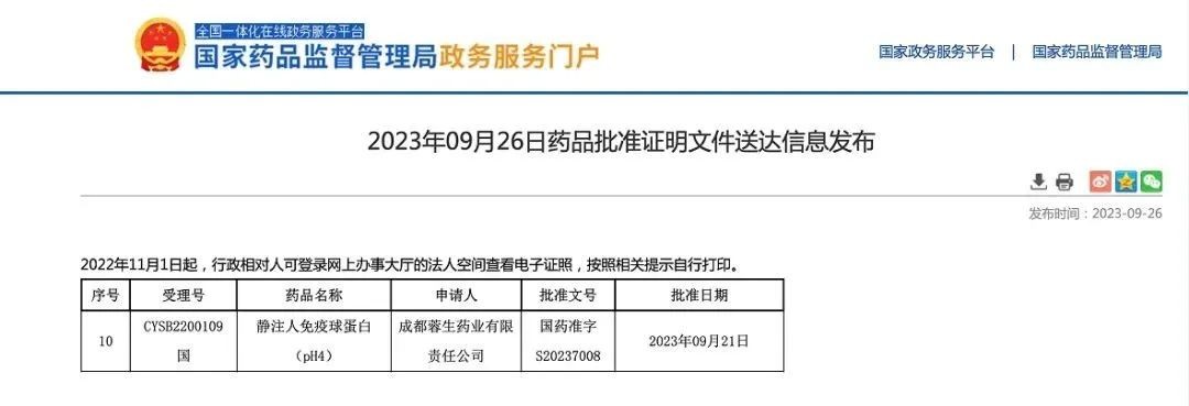 9月26日,根据国家药品监督管理局(NMPA)官网发布的最新公告,国药集团中国生物血液制品板块企业天坛生物所属成都蓉生药业有限责任公司(简称“成都蓉生”)研发生产的第四代静注人免疫球蛋白(pH4)(“蓉生静丙®10%”)成功获批。这是国内首个用层析法研制的丙种球蛋白,多项质量指标高于欧洲药典和中国药典标准,标志着我国静丙产业水平迈入了国际先进行列。